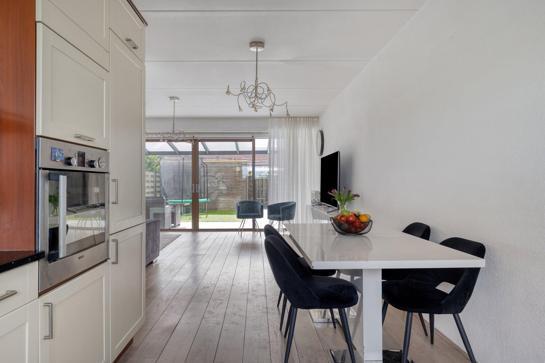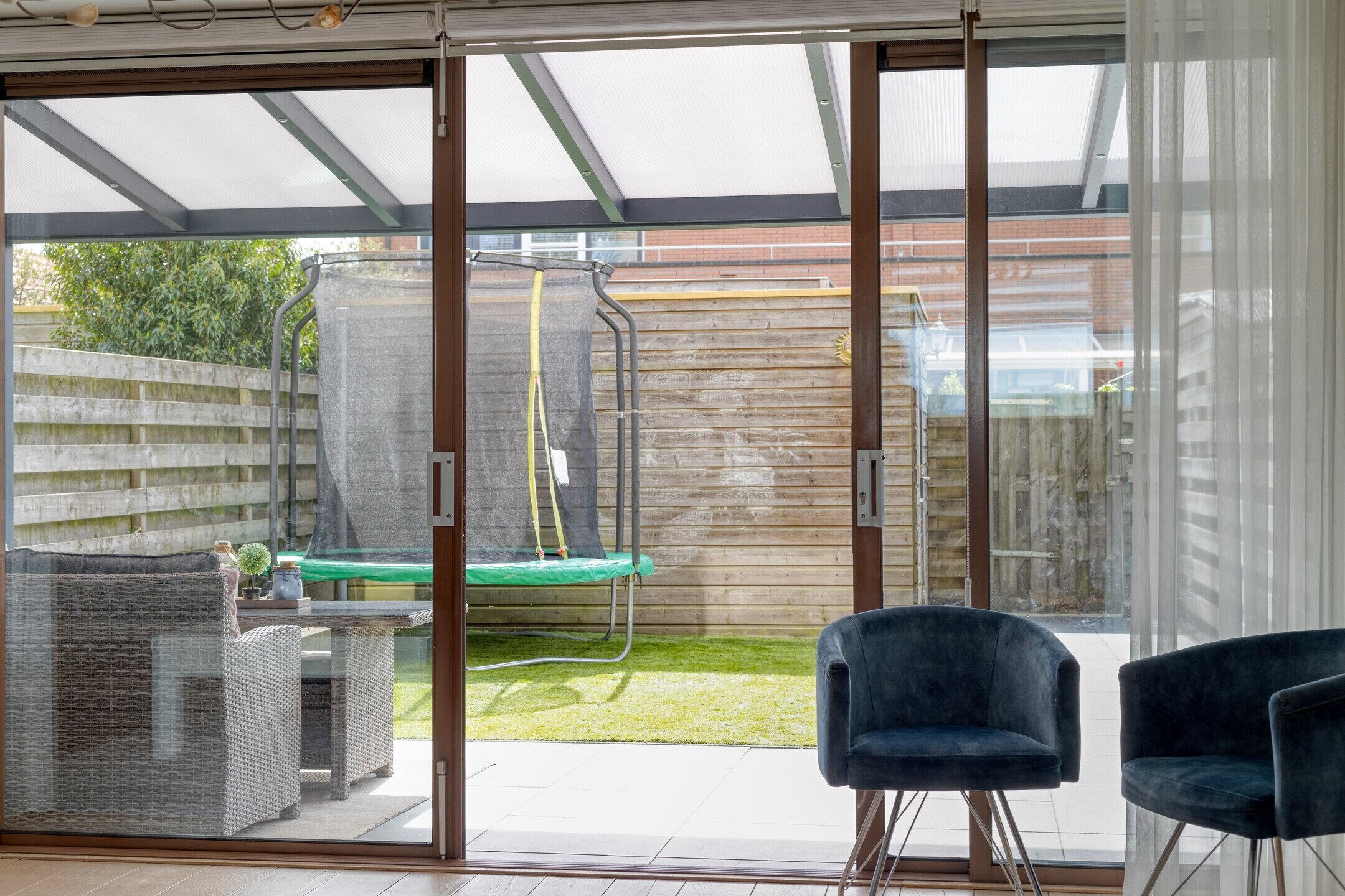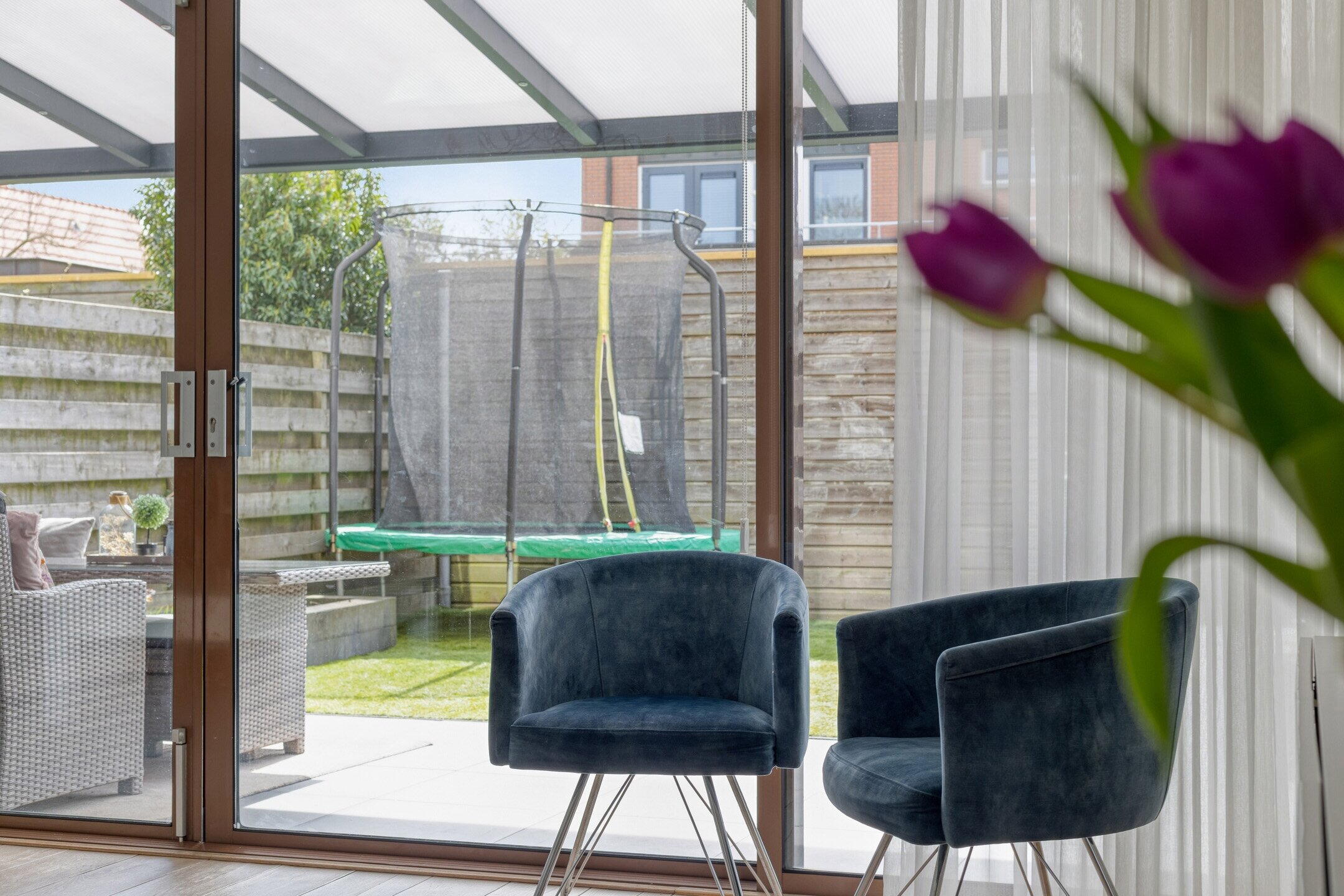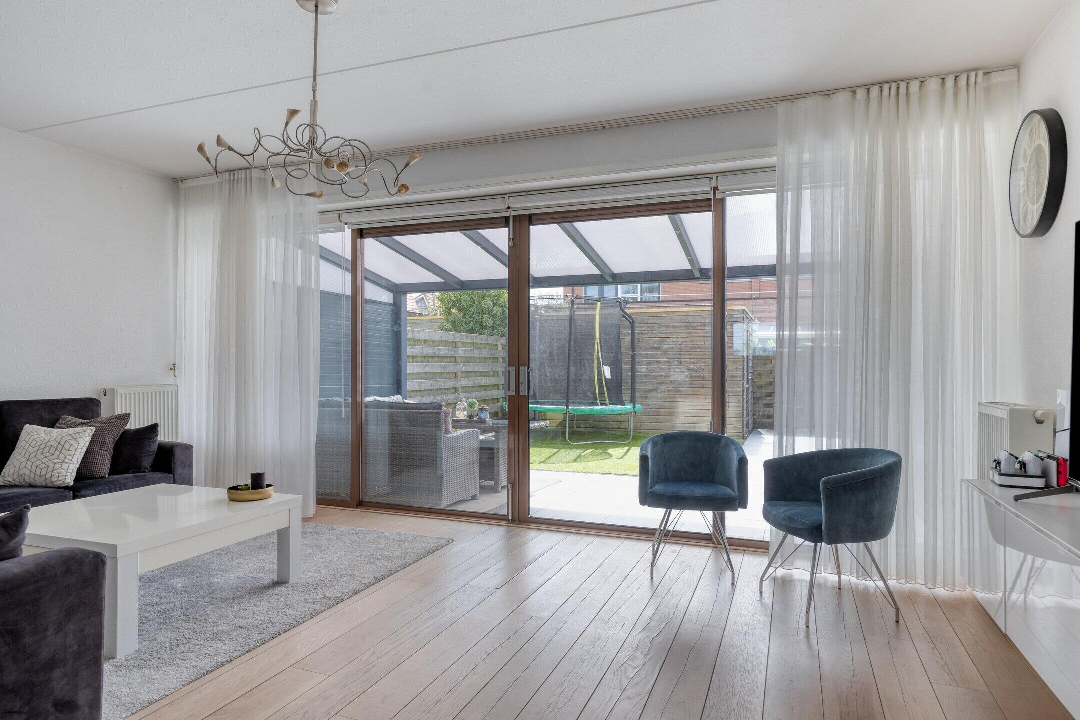 Via de entree komt u in de hal met toilet, garderoberuimte en toegang tot de trapkast. Vanuit hier betreedt u de ruime en lichte woonkamer. De houten vloer geeft de ruimte een warme en sfeervolle uitstraling. De grote schuifpui naar de tuin zorgt voor veel lichtinval en een fijne verbinding met buiten. Dankzij de in 2023 geplaatste overkapping wordt direct zonlicht op de ramen beperkt, waardoor het binnen aangenaam koel blijft tijdens warme dagen.