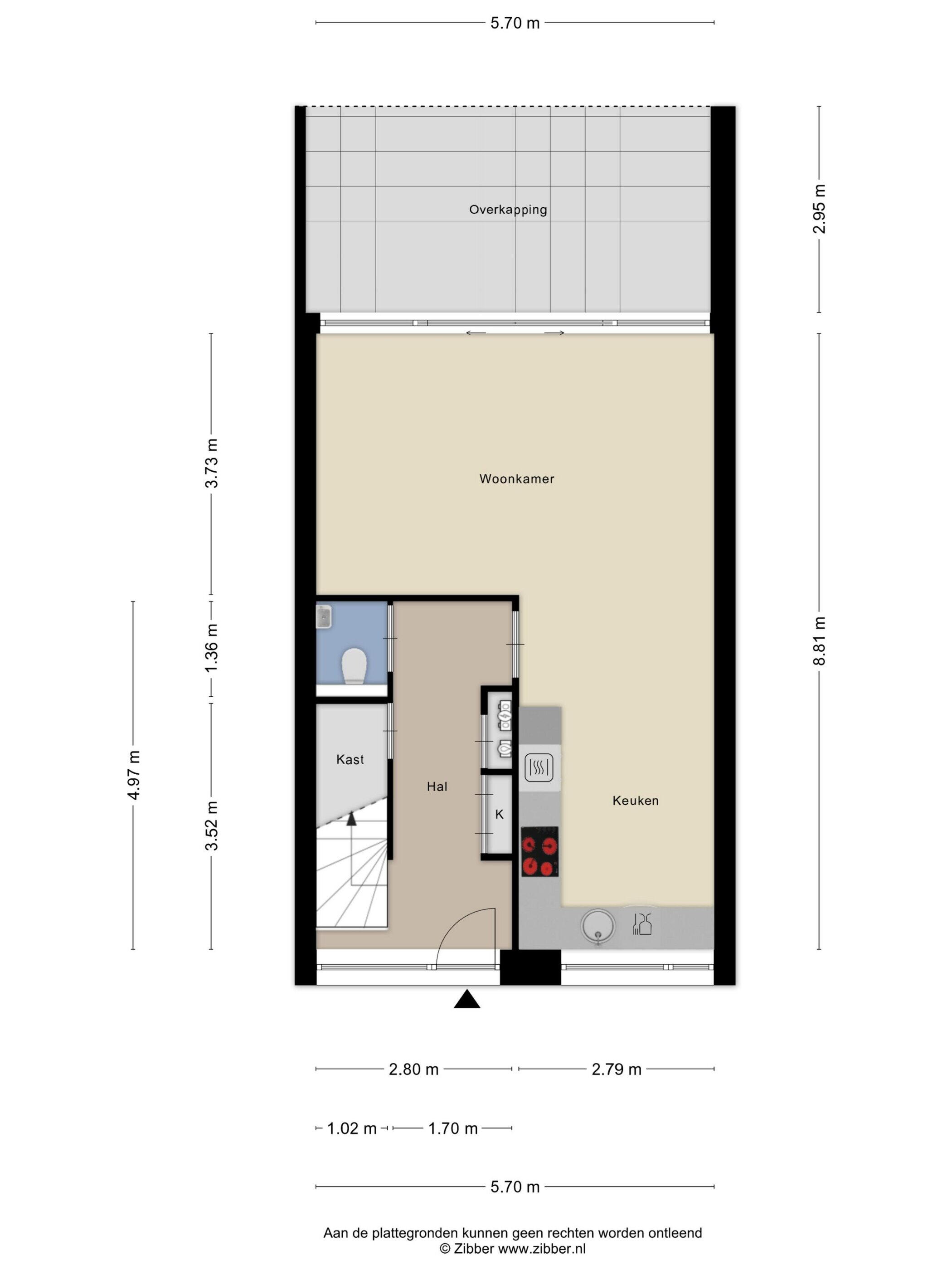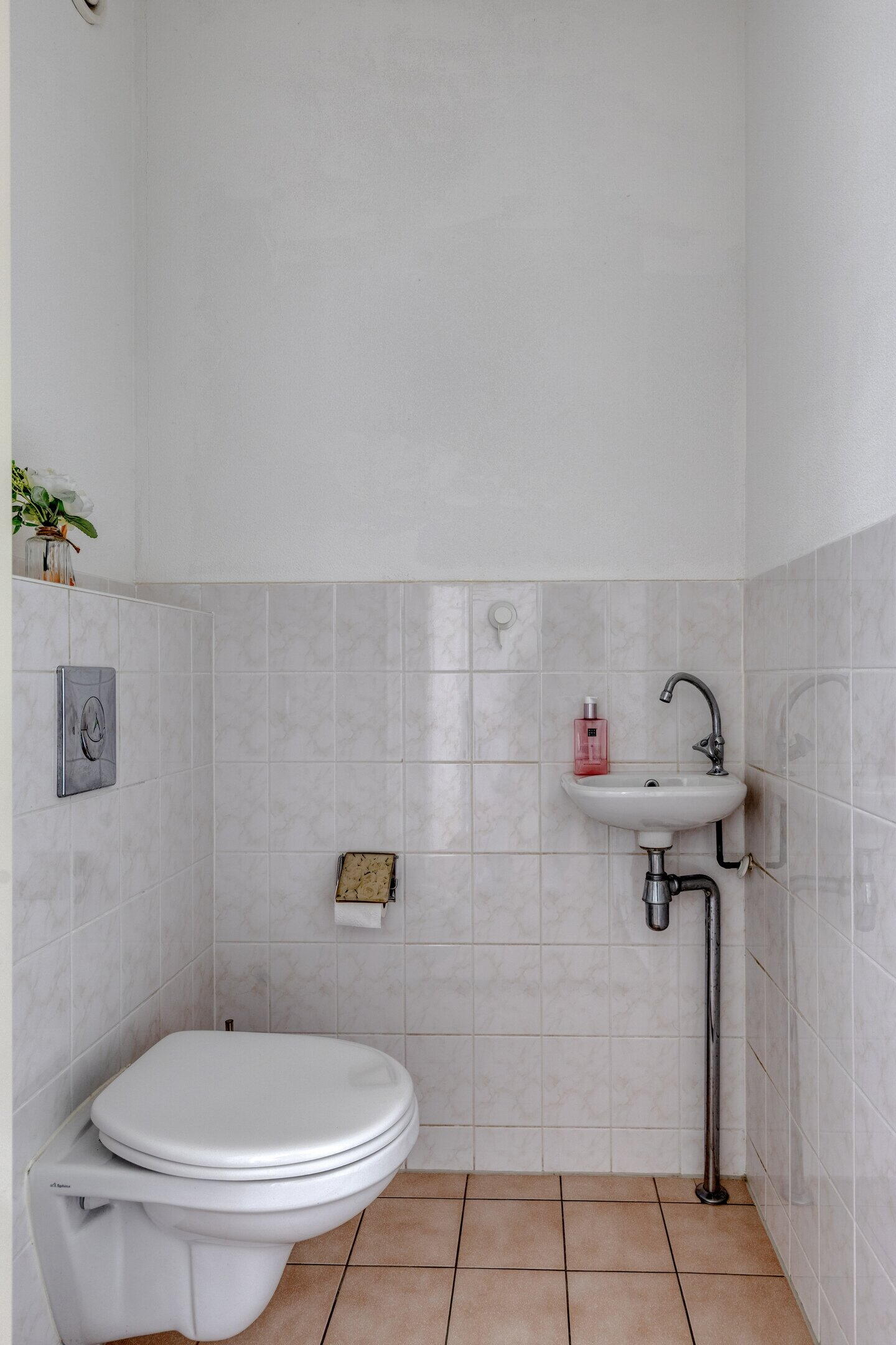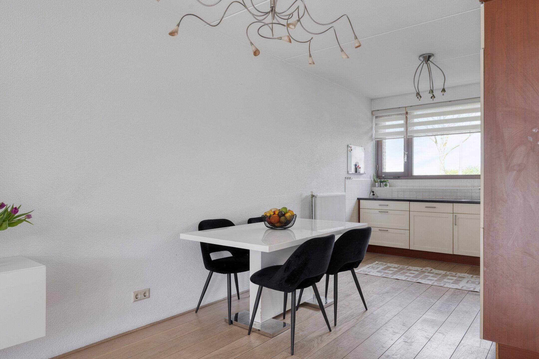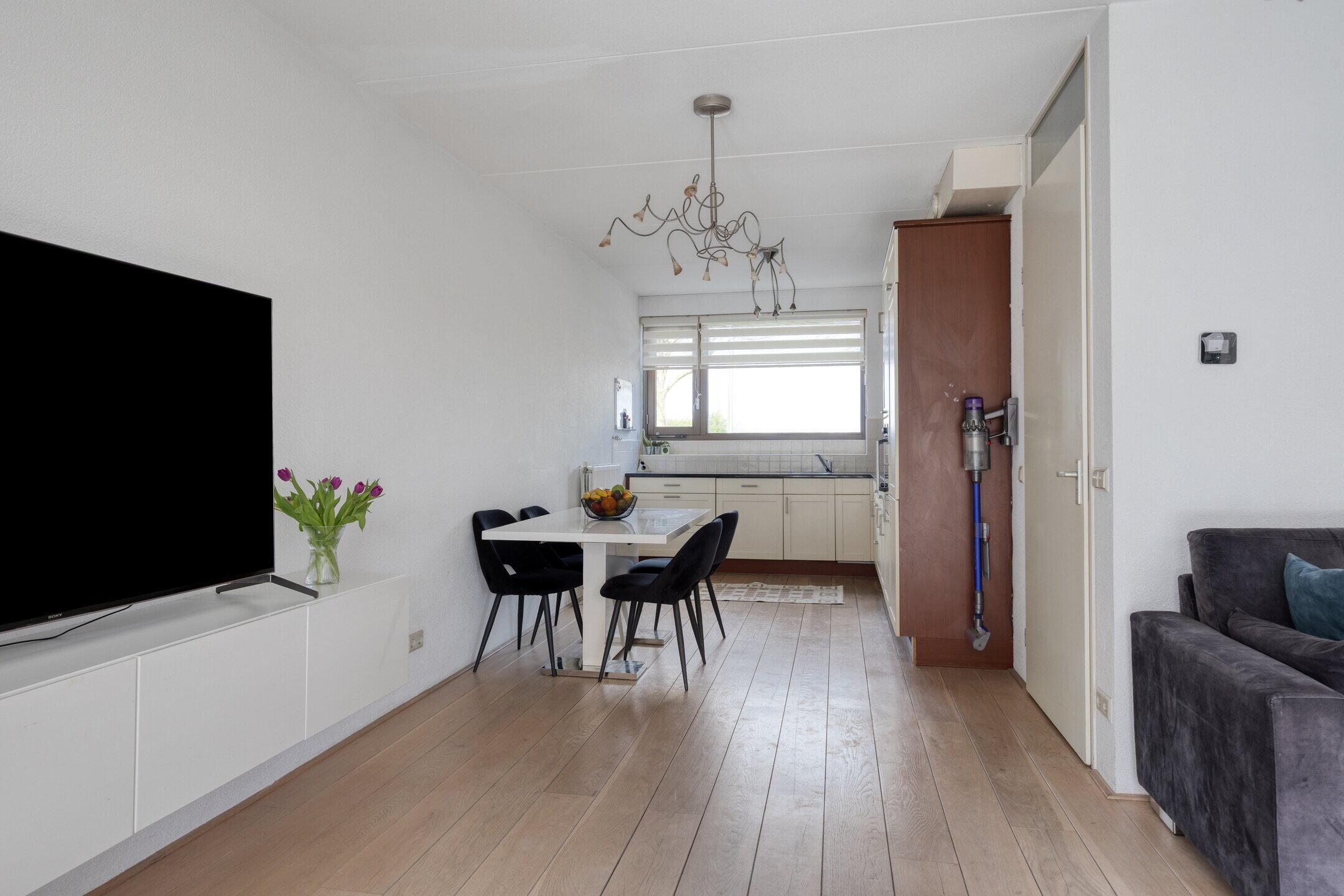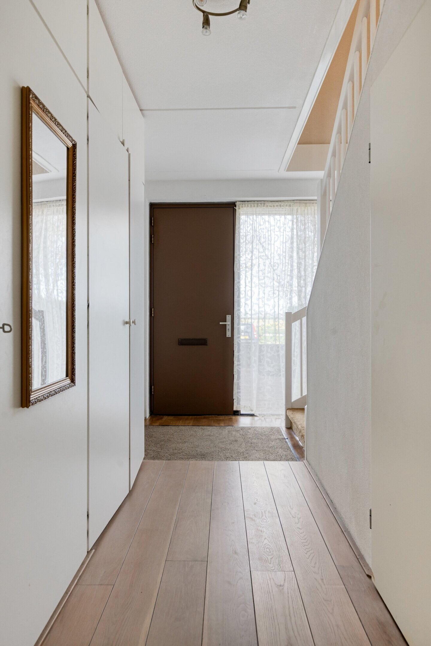 Via de entree komt u in de hal met toilet, garderoberuimte en toegang tot de trapkast. Vanuit hier betreedt u de ruime en lichte woonkamer. De houten vloer geeft de ruimte een warme en sfeervolle uitstraling. De grote schuifpui naar de tuin zorgt voor veel lichtinval en een fijne verbinding met buiten. Dankzij de in 2023 geplaatste overkapping wordt direct zonlicht op de ramen beperkt, waardoor het binnen aangenaam koel blijft tijdens warme dagen.