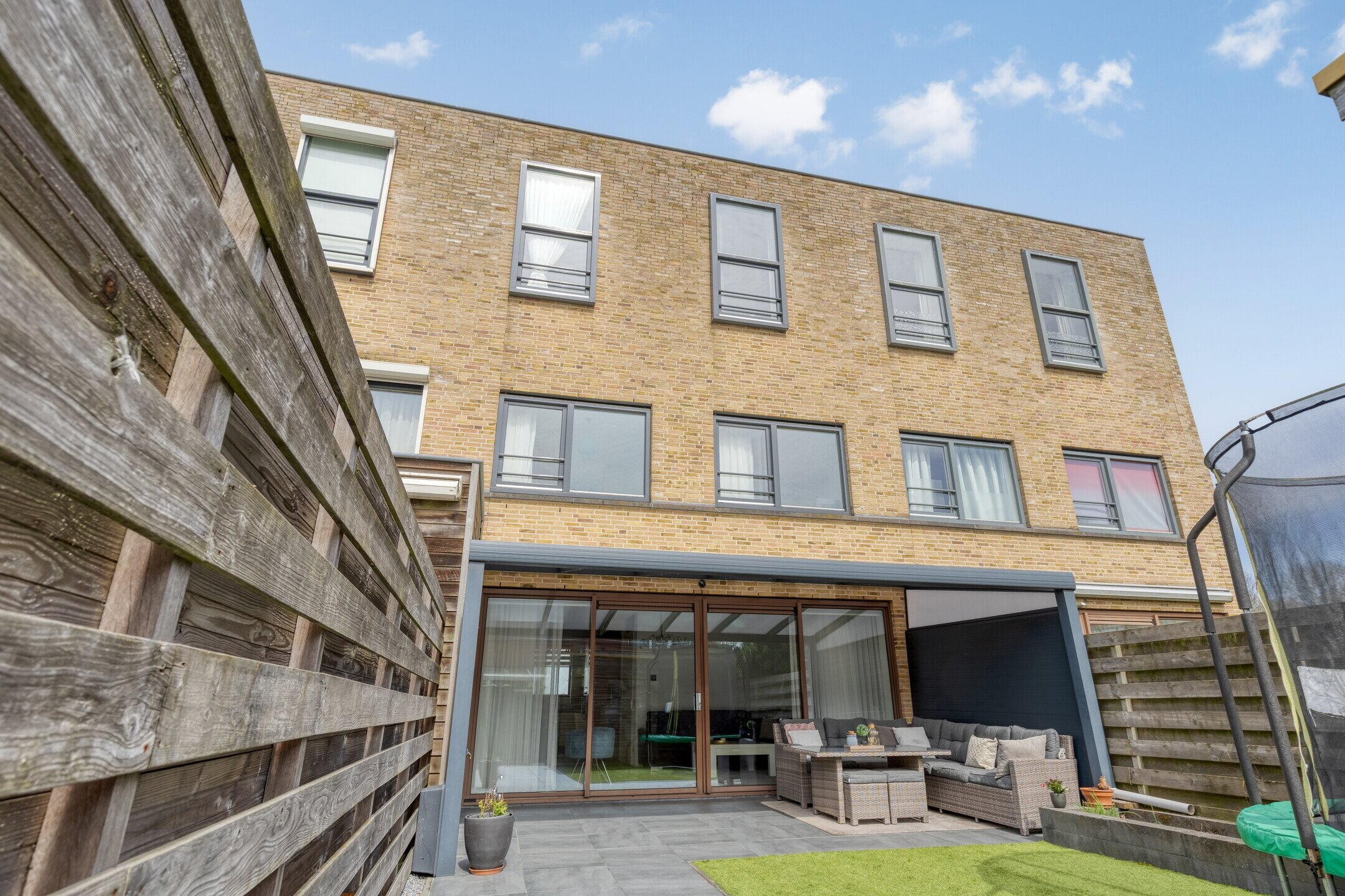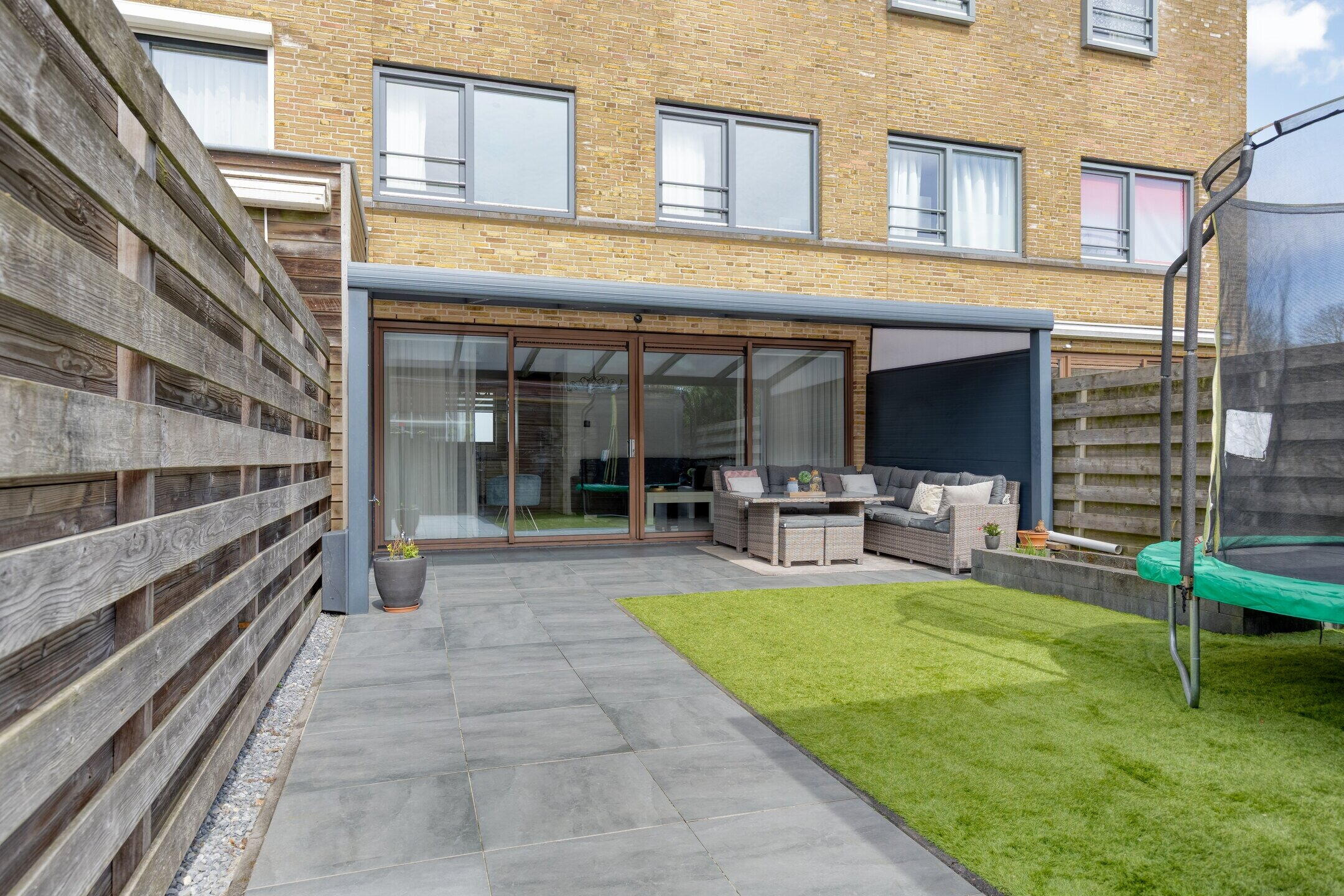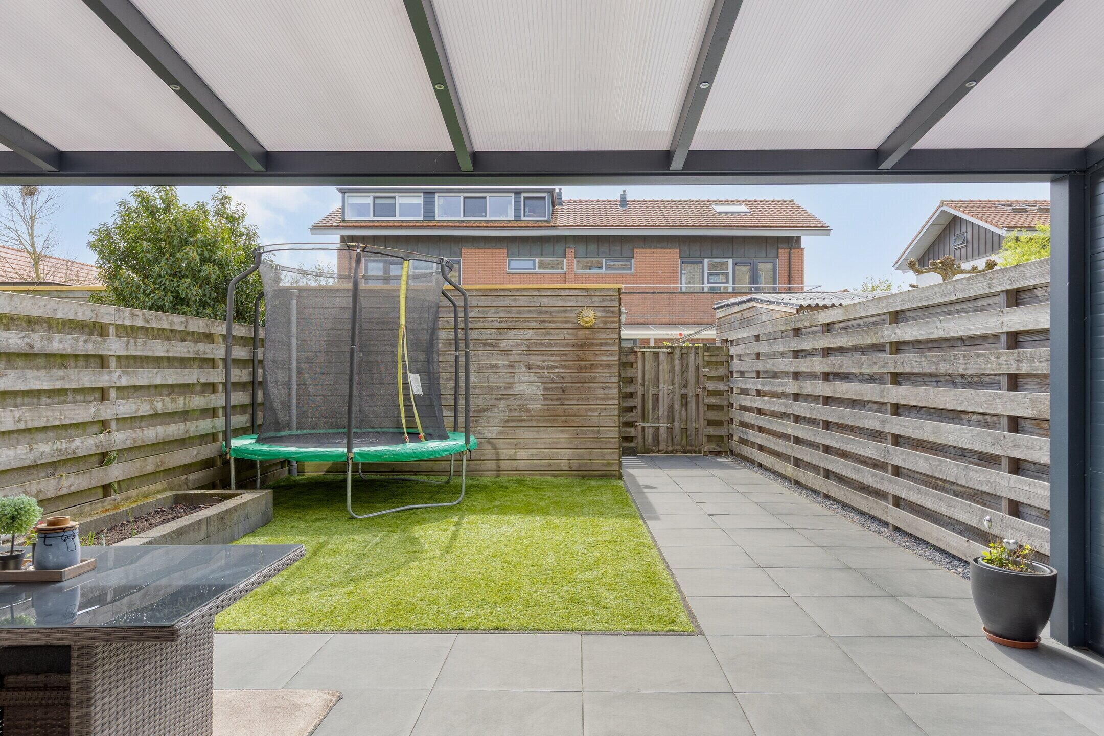 De achtertuin is gelegen op het zuiden is onderhoudsvriendelijk aangelegd en biedt volop zon en privacy. De in 2023 geplaatste overkapping zorgt voor een fijne schaduwplek, waardoor u hier ook op warme dagen comfortabel kunt zitten. Achterin de tuin bevindt zich een vrijstaande houten berging, ideaal voor fietsen en extra opslag.