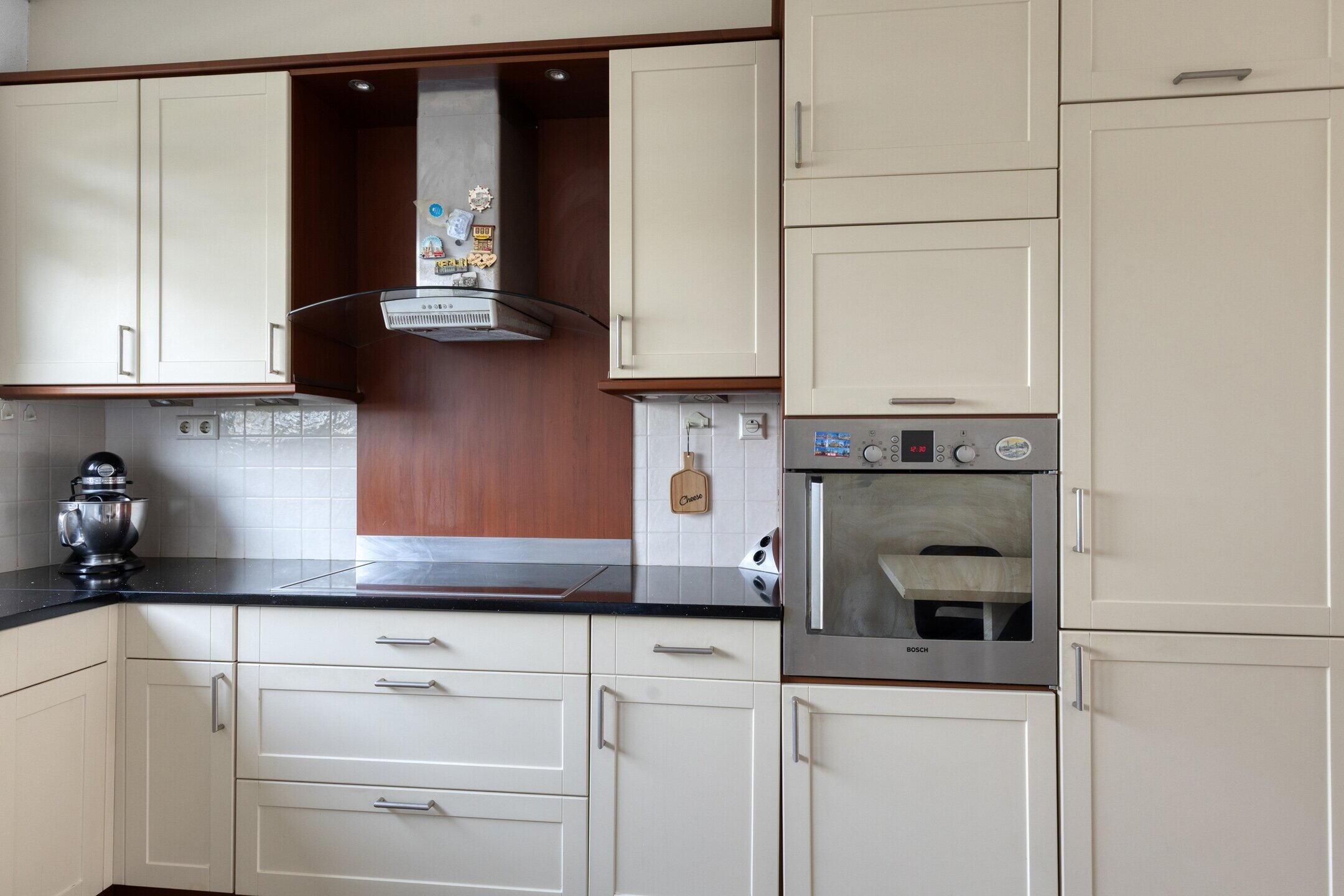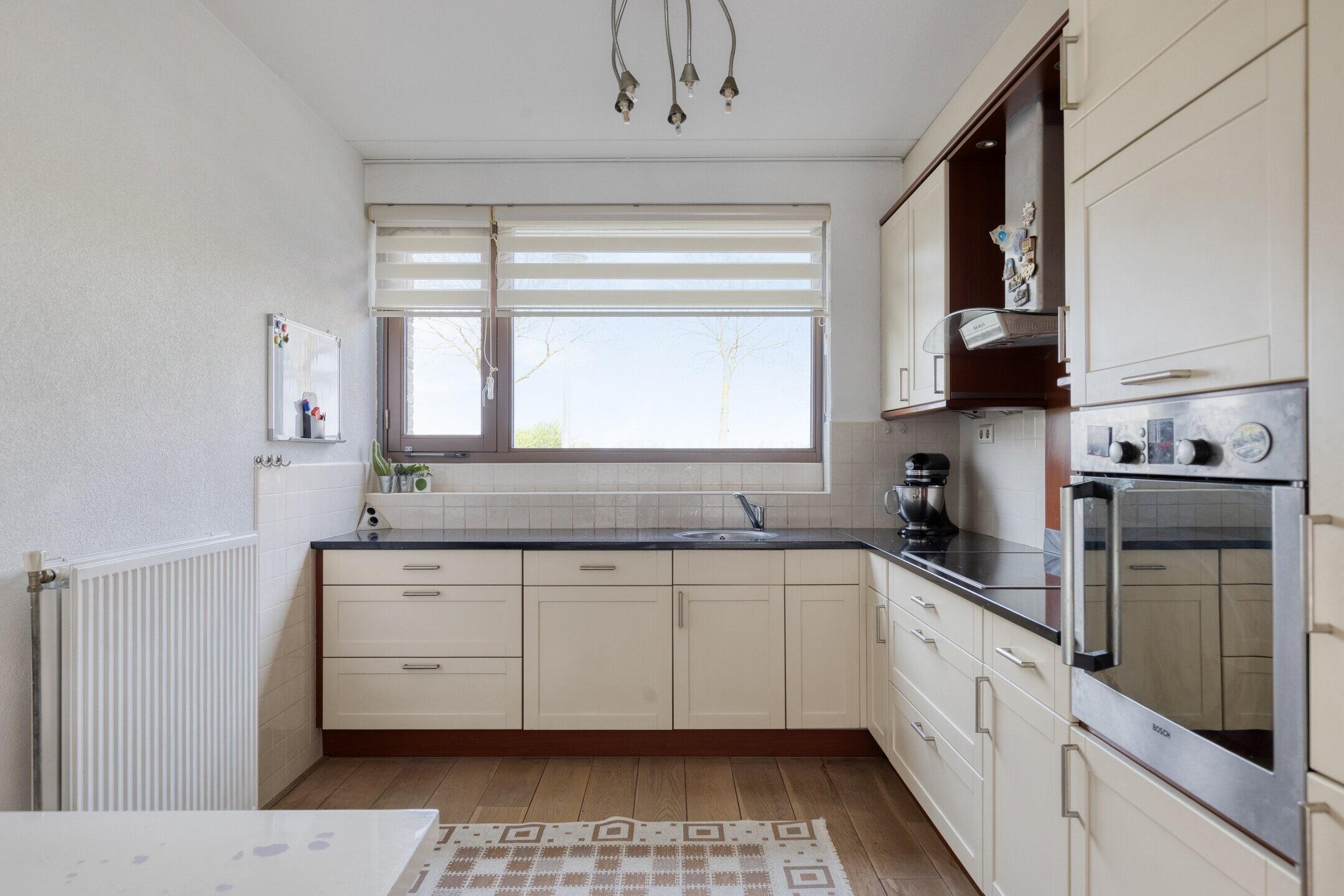 De open keuken is ruim opgezet en van alle gemakken voorzien, waaronder een inductiekookplaat met afzuigkap, oven, vaatwasser en een koel-/vriescombinatie. Ook hier zorgen de ramen aan de voorzijde voor een prettige lichtinval.